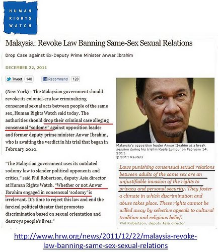Pendapat ini disokong oleh Pemantau Hak Asasi (HRW) yang menggesa Malaysia agar menghapuskan undang-undang diskriminasi ke atas pelaku seksual songsang seperti Anwar Ibrahim. HRW memetik Prinsip-PrinsipYogjakarta yang memperihalkan tentang PERSETUJUAN dunia bahawa SEKS SUKA SAMA SUKA adalah hak privasi dan hak tersebut tidak boleh dilanggar sama sekali.